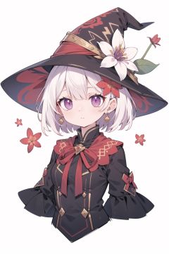 quality_best,style_onineko,(Distinct pupils)(Clear eyes),wizard hat,1girl,solo,c,earrings,looking at viewer,flower,short hair,bangs,closed mouth,simple background,black headwear,white background,red flower,upper body,white hair,hair intakes,frills,purple eyes,hair ornament,expressionless,hat flower,eyelashes,best quality,