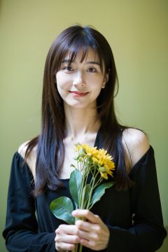 Best Quality,Masterpiece,Ultra High Resolution,(Realisticity:1.4),Original Photo,1girl,smirk,hair with bangs,black long dress,flower,
