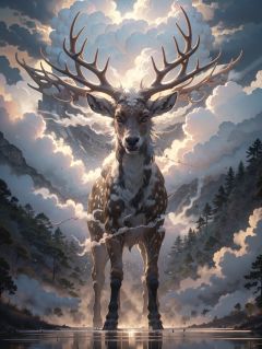 BJ_Sacred_beast, deer, solo, looking_at_viewer, open_mouth, outdoors, sky, cloud, no_humans, glowing, animal, cloudy_sky, glowing_eyes, antlers,cinematic lighting,strong contrast,high level of detail,Best quality,masterpiece,<lora:Sacred_beast_v1.2:0.7>,