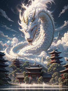 BJ_Sacred_beast,red_eyes,outdoors,horns,sky,cloud,no_humans,bird,cloudy_sky,scenery,stairs,fantasy,dragon,architecture,east_asian_architecture,eastern_dragon,cinematic lighting,strong contrast,high level of detail,Best quality,masterpiece,<lora:Sacred_beast_v1.2:0.7>,
