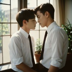 analog film photo masterpiece, Handsome boy, 2 Boys, Hug, Kiss, 18 years old, Lovely, Short hair, White shirt, Tie, Portrait, Living room, Potted plant, Light and shadow, The sunshine outside the window, Students, textured skin, super detail, best quality <lora:HandsomeBoy_V1-000002:0.5> . faded film, desaturated, 35mm photo, grainy, vignette, vintage, Kodachrome, Lomography, stained, highly detailed, found footage