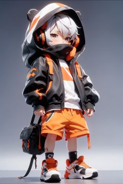 masterpiece,best quality,8K,1boy, male focus, solo, shorts, headphones, jacket, chibi, bag, shoes, brown eyes, white hair, full body, black shorts, bandaid, male child, looking at viewer, backpack, hood, standing, child, shirt, sneakers, short hair, black jacket, white shirt, grey background, closed mouth, open clothes, open jacket,orange color
