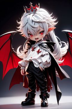1boy, red eyes, male focus, crown, pointy ears, vampire,chibi, solo, wings, cape, white hair, jewelry, earrings, red footwear, long hair,pants, white gloves,black cape, shirt, smile, white shirt, looking at viewer, mini crown, black pants, gradient background, fang, standing, gradient, open mouth, red wings, blood, black background, full body