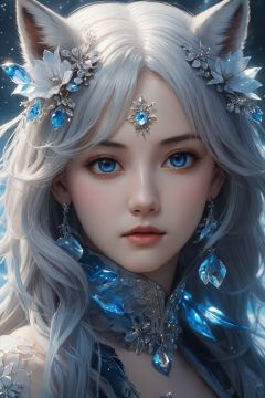 masterpiece, best quality,official art, extremelydetailed cg 8k wallpaper,(flying petals)(detailed ice) , crystalstexture skin, coldexpression, ((fox ears)),white hair, longhair, messy hair, blue eye,looking at viewer,extremely delicate andbeautiful, water, ((beautydetailed eye)), highlydetailed, cinematiclighting, ((beautiful face),fine water surface, (originalfigure painting), ultra-detailed, incrediblydetailed, (an extremelydelicate and beautiful),beautiful detailed eyes,(best quality)