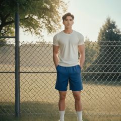 analo film photo Handsome Boy, solo, 1boy, male focus, fence, shorts, bara, short hair, shirt, outdoors, muscular male, muscular, tree, black hair, full body, blue shorts, shoes, pectorals, realistic, socks, sky, looking at viewer, cloud, leaf, standing, day, grass, chain-link fence, sunlight, closed eyes ,faded film, desaturated, 35mm photo, grainy, vignette, vintage, Kodachrome, Lomography, stained, highly detailed, found footage