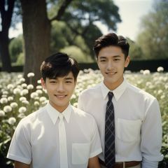 analog film photo masterpiece, Handsome boy, 2 Boys, Chase, 18 years old, Lovely, Short hair, White shirt, Tie, Portrait, Garden, Flowers, Light and shadow, Students, Asian, Smile, Flying dandelions, textured skin, super detail, best quality ., faded film, desaturated, 35mm photo, grainy, vignette, vintage, Kodachrome, Lomography, stained, highly detailed, found footage