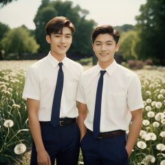 ****og film photo masterpiece, Handsome boy, 2 Boys, Chase, 18 years old, Lovely, Short hair, White shirt, Tie, Portrait, Garden, Flowers, Light and shadow, Students, Asian, Smile, Flying dandelions, textured skin, super detail, best quality ., faded film, desaturated, 35mm photo, grainy, vignette, vintage, Kodachrome, Lomography, stained, highly detailed, found footage