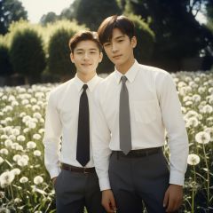 analog film photo masterpiece, Handsome boy, 2 Boys, Chase, 18 years old, Lovely, Short hair, White shirt, Tie, Portrait, Garden, Flowers, Light and shadow, Students, Asian, Smile, Flying dandelions, textured skin, super detail, best quality . , faded film, desaturated, 35mm photo, grainy, vignette, vintage, Kodachrome, Lomography, stained, highly detailed, found footage