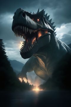 Hyperrealistic art BJ_Sacred_beast, T-rex, open_mouth, outdoors, sky, teeth, cloud, water, tree, no_humans, saliva, glowing, cloudy_sky, fire, sharp_teeth, nature, glowing_eyes, forest, monster, giant, kaijuu, godzilla,cinematic lighting,strong contrast,high level of detail,Best quality,masterpiece,White background,<lora:SDXL_Sacred_beast:0.6>, . Extremely high-resolution details, photographic, realism pushed to extreme, fine texture, incredibly lifelike
