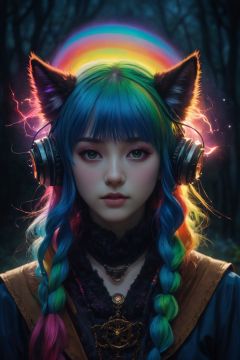 masterpiece, best quality, ultra high res, highly detailed, (psychedelic art:1.4), (woman, demon:1.3), (floating in dark mist:1.1), furry girl, anime furry women, ((best quality)), ((masterpiece)), ((realistic)), (detailed), portrait, close up, young female, RAW photo, uhd, dslr, rainbow hair, high quality, realistic, photo realistic, dreamlikeart, lens flare, upper body, looking at viewer, animal focus, furry, wolf fursuit, 1girl, cute, kawaii, lovely, fur, fur head, wolf head, narrow waist, wolf ears, black chocker, blush, paw, paw shoes, rainbow clothes, stunning gradient colors, no watermark signature, detailed background, woods, small lake with island, insanely detailed, visually stunning, wicked, hypnotic, alluring, cowboy shot, intricate, perferct shading, veil, beautiful, award-winning illustration, cosmic space background, ethereal atmosphere, ultra quality, beautiful girl, cosmical concept, rainbow strings, rainbow skin, rainbow bloody veins growing and intertwining out of the darkness, nailed wire, oozing thick blue blood, sharp neon, veins growing and pumping blood, vascular networks growing, green veins everywhere, yin and yang, glowing space, glowing stars, infinity symbol, dynamic pose, flying pose, glowing body, (rainbow aura:1.1), beautiful angel, clockwork, lightning, majestic, breathtaking