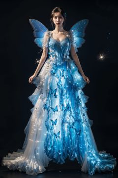 ((masterpiece)), ((best quality)), 8k, high detailed,1girl, 20-year-old,wings, dress, blue background, standing, glowing, butterfly wings, full body, light particles, contouring light, fairy dress
