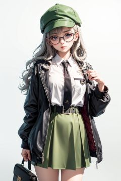 1girl, solo, green headwear, shirt, glasses, hat, white shirt, long hair, skirt, open clothes, belt, bag, long sleeves, simple background, long skirt, jacket, necktie, collared shirt, black necktie, round eyewear, closed mouth, looking at viewer, hand up, brown eyes, white background, grey hair, black-framed eyewear, holding, pocket, open jacket, green jacket, standing, buckle, shoulder bag, belt buckle, wing collar, black belt, shirt tucked in, bangs, breast pocket, green skirt, wavy hair, feet out of frame, blush, high-waist skirt, buttons, name tag, character name