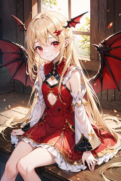(loli:1.2),(petite:1.2),sitting,masterpiece, {highres},((ultra-detailed)),(detailed light),ray tracing,{an extremely delicate and beautiful},1girl,loli,(blonde clothes:1.2),(red clothes:1.2),white clothes,bangs,blue bat wings,detached sleeves, hair ornament, head wings, long hair, looking at viewer, pointy ears,red eyes, smile, solo,cuteloli