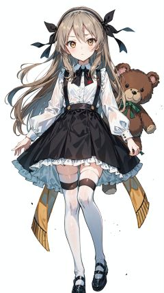 1girl, shimada arisu, solo, stuffed toy, teddy bear, stuffed animal, striped, thighhighs, long hair, boko (girls und panzer), brown eyes, white background, striped thighhighs, ribbon, simple background, looking at viewer, full body, hair ribbon, blush, hairband, bandages, skirt, mary janes, shoes, long sleeves, light brown hair, standing, one side up, shirt, suspenders, holding stuffed toy, brown hair