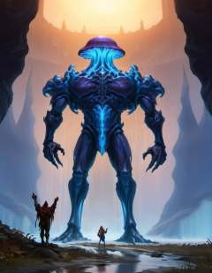 a giant menacing blue mushroom with strong arms and legs is towering over a minuscule human figure, low point of view, fantasy, sunset, sunbeam, particles, fog, backlighting <lora:XLPUNK_0.3_RC:0.8>