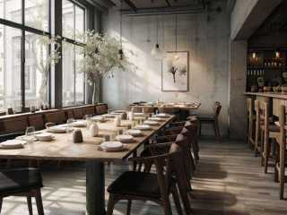 masterpiece, best quality,areswabi,Wabi-sabi style restaurant design, modern furniture, modern soft furnishings, modern accessories, minimalism, urban, urban look, glass, long rainbow glass partition, white walls, dining table, tableware, dining table and chairs, cabinets, storage cabinets, lamps, decorative paintings, greenery, realistic texture, realism, photography, ultra-high definition, wide-angle, full frame