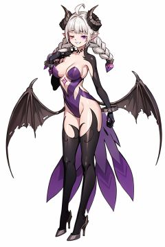 (best quality), ((masterpiece)), (highers), original, extremely detailed CG unity 8k wallpaper,Nyarly, pointy ears, twin braids, high heels, purple eyes, black thighhighs, demon wings, demon horns, purple leotard,1girl,full_body,standing,hand on chest,heel up, one eye closed, grin,simple background, white background,, <lora:Nyarly_DNF:0.7>