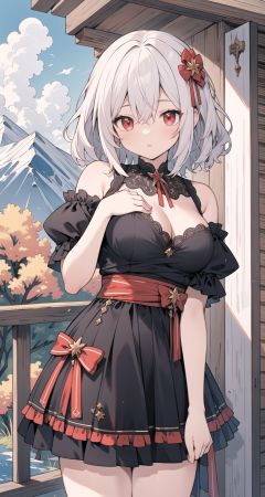 (masterpiece, best quality, high quality, highres, ultra-detailed), short hair, silver hair, red eyes, wavy hair, breasts, frills, outdoors, mountain, close-up, alternate costume