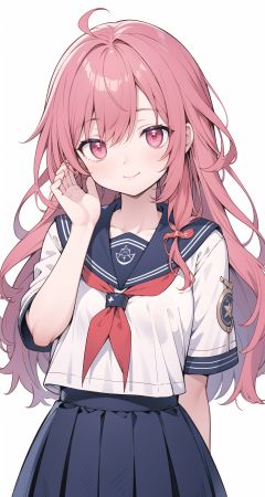 👋, simple background, white background, pentagram, pink eyes, red neckwear, red hair, hair over shoulder, long hair, asymmetrical hair, serafuku, sailor dress, upper body, smile, seductive smile