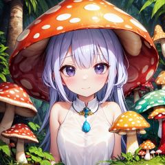 (monsterification:1.3), (1 giant mushroom_girl, wearing Spotted dress, spotted mushroom hair), (spotted mushroom hat:1.2), (upper body), (cute face), beautiful eyes