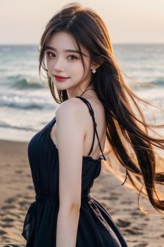 Seaside Beach,HDR,UHD,8K,Highly detailed,best quality,masterpiece,1girl,realistic,Highly detailed,(EOS R8,50mm,F1.2,8K,RAW photo:1.2),ultra realistic 8k cg,earrings, solo, 1girl, , long hair, Wind, flowing hair, kind smile, , pose for picture, , looking_at_viewer, , perfect body, , blue dress, jewelry,eluosi