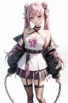 1girl, solo, phone, pink background, bow, fishnets, holding, fishnet thighhighs, cellphone, skirt, holding phone, jacket, frills, double bun, thighhighs, pink bow, black hair, black jacket, long hair, purple eyes, bangs, multicolored hair, simple background, hair bun, heart, shirt, hair ornament, socks, bandaid, looking at viewer, twintails, bandaid on leg, hair bow, ahoge, long sleeves, off shoulder, single thighhigh, smartphone, white shirt, black bow, sleeves past wrists, virtual youtuber, feet out of frame, standing, kneehighs, heart hair ornament, pink eyes, pink hair, asymmetrical legwear, chain, purple hair, parted lips, choker, grey skirt, breasts, bandaid on knee, very long hair, puffy sleeves, belt, streaked hair, blunt bangs, cleavage