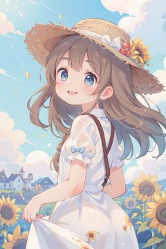((masterpiece)),(best quality),(solo),(highres),((extremely detailed CG wallpaper)),(cinematic lighting:1.3),((extremely detailed illustration)),(best shadow),dynamic angle,depth of field,(summer day),(clear blue sky and many white clouds background:1.5),(over the sea:1.4),(the best building:1.2),(sunflowers field:1.2),complex detail,(detailed background),(dreamlike),day,(ablaze with warm lights:1.4),floating petal,flowing particles,(reflection:1.2),(upper body:1.2),(cowboy shot:1.2),clear blue sky,(1girl:1.4),(20s:1.2),(kawaii),(ambiguous gender),(bishoujo:1.4),(white longdress:1.3),(pale blue eyes:1.3),(light brown hair:1.4),smooth long hair,floating hair,(delicate clothes),(straw hat:1.2),(extremely detailed cute face:1.2),(smlie:1.3),(indifferent:1.2),mute,(beautiful detailed face:1.3),flat chest,(looking back:1.3),ccjmo,