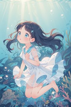 Masterpiece,best quality,1girl,aquafrilled dress dress,(Clothes that blend with the sea:1.2),lightblue long hair,floating hair,delicate face,A delicate expression,Desiring expression,in container,underwater,rolling_bubbles,(neon light:0.8),Sunlight goes underwater,Wonderful underwater,