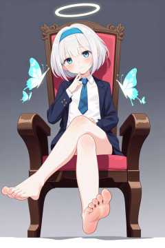 Masterpiece,best quality,top tier,1 girl,viewed from below (with feet focused),medium chest,hollow eyes,annoying face,sitting in a chair (with bare feet),A simple background,Arona (blue file ),arona,white hair band,butterfly tie hair band,halo,butterfly tie hair band,short hair,single braid,
