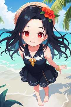 (masterpiece),(best quality),(ultra-detailed),illustration,Dynamic angle,1girl,game character portrait,colorful,beautiful detailed eyes,portrait,colorful,translucent hair,(glowing inner hair),the perfect appearance,black hair,dull red eyes,long hair,cloud,navy blue sleeveless dress,summer,sea,Flower hat,smile,looking at viewer,(from above:1.2),style of final fantasy,arms behind back,beach,hairpin,(wreath on head),coconut tree,(bracelet),(barefoot sandals),looking at viewer,floating hair,sideburns,forehead,