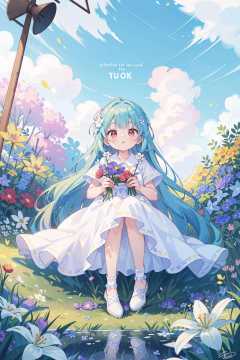 ((best quality)),((masterpiece)),((ultra-detailed)),(illustration),(detailed light),(an extremely delicate and beautiful),((trim)),incredibly_absurdres,(ray tracing),(reflection light),((Movie Poster)),(signature:1.3),(English text:1.3),BREAK (8k:1.3),Wallpaper,1girl,(girl middle of flower:1.4),(pure skyblue hair, red eyes:1.5),clear sky,outside,ultra-detailed,best quality,extreme quality,Masterpiece,beautiful,pretty,sitting on the ground,(absurdly long hair, clear boundaries of the cloth:1.4),(pure white dress, pure white silk cloth:1.5),(ground of flowers, thousand of flowers, colorful flowers, flowers around her, various flowers:1.51),young,stunning,attractive,sundress,fantastic scenery,pure white shoes,