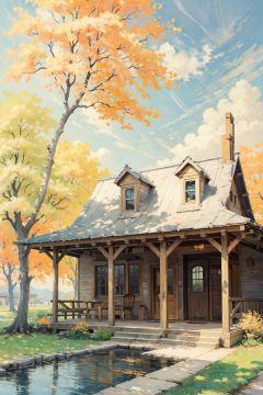 (((masterpiece))), ((extremely detailed CG unity 8k wallpaper)), best quality, high resolution illustration, Amazing, highres, intricate detail, (best illumination, best shadow, an extremely delicate and beautiful), 2D ConceptualDesign, scenery, outdoors, cloud, day, sky, tree, blue sky, mountain, landscape, water, backpack, Oil painting, autumn,There is a crow on the tree, pavilion, withered vine