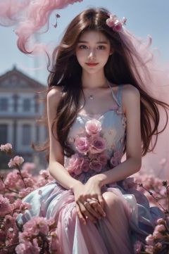 (Long hair: 1.2) 1 girl, solo, pure face, yellow flowers, white dress, sky, messy hair, outdoor, sitting during the day, necklace, blue sky, jewelry, blurry, blurry, lips parted, sleeveless, (pink smoke and purple flower background: 1.2), high-resolution, masterpiece, best quality (Hasselt photography), fine skin, clear focus, eluosi, wedding dress,(blue dress),(blue theme),