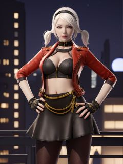 CFshenpanzheQF, 1girl, solo, gloves, breasts, skirt, jacket, midriff, hairband, short twintails, choker, fishnet pantyhose,cowboy shot,white hair, <lora:CFshenpanzheQF:0.75>,cityscape, night, looking at viewer, mature female, hand on hip,