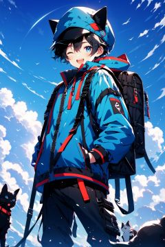 1boy,one eye closed,male focus,cat,black hair,open mouth,smile,blue eyes,sky,gloves,hat,bag,cloud,backpack,animal,pants,looking at viewer,outdoors,blue sky,day,short hair,jacket,black pants,long sleeves,hood,standing,solo,black gloves,