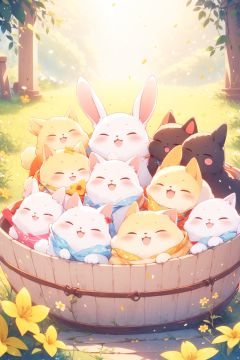 no humans,cat,flower,animal,closed eyes,closed mouth,leaf,blush,yellow flower,animal focus,open mouth,rabbit,smile,