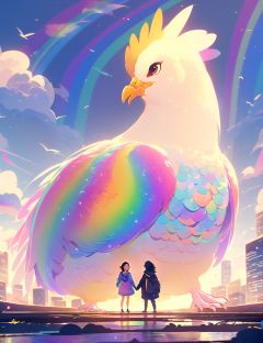 sxshs, a huge Chicken, 2girls, holding hands, hood, sky, standing, dress, bag, outdoors, 1boy, rainbow, black hair, colorful, city, hoodie, shadow, cloud, backpack, scenery, hood down<lora:MW_scshs_v12:1>