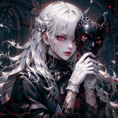 1girl,vampire,white hair, gloves, male focus, mask, solo, red eyes, white gloves, white hair, looking at viewer, holding mask, feather, intricate and very beautiful and elegant, highly detailed, digital painting, artstation, concept art, smooth and sharp focus, cg,red eyes,