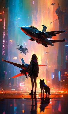 masterpiece,(best quality:1.3),<lora:ArienGirlWolf-LORA:1>,1girl,arien_wolf,cyberpunk,aircraft,