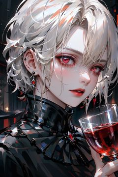 1mature female,vampire,vampire, 1girl, cup, jewelry, earrings, solo, drinking glass, red eyes, holding, holding cup, wine glass, profile, alcohol, white hair, red lips, breasts, looking down, from side, wine, parted lips, gloves, gem, upper body, makeup,best quality, high resolution illustration, Amazing, highres, intricate detail, best illumination, best shadow, an extremely delicate and beautiful,looking at viewer,(close up,portrait:1.5),