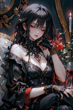 1mature female,jewelry, male focus, black hair, solo, earrings, ring, ((sitting)), closed eyes, black pants, pants, closed mouth, multicolored hair, sofa,  from side, wine, parted lips, gloves, gem, upper body, makeup,best quality, high resolution illustration, Amazing, highres, intricate detail, best illumination, best shadow, an extremely delicate and beautiful,looking at viewer,