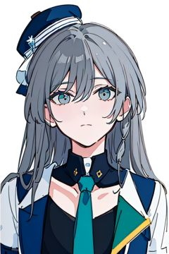 (masterpiece:1.3),(the best quality:1.2),(super fine illustrations:1.2),(Masterpiece),high quality,high detail,(white background:1.2),looking at viewer,(SOLO:1.4),outline,simple background,<lora:符华-偶像:0.8>, hair ornament,hair between eyes,shirt,thighhighs,blue headwear,hat,boots,braid,skirt,necktie,grey hair,shorts,low-tied long hair,cheerleader,