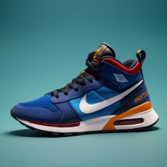 (Studio photography),(Concept design),(Highlighting unique sneakers with a commercial style),(set against a striking blue background),(crafted in cinematic, photorealistic detail),(and rendered in stunning 8K resolution).