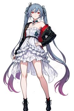 (masterpiece:1.3),(the best quality:1.2),(super fine illustrations:1.2),(Masterpiece),high quality,high detail,(white background:1.2),looking at viewer,(SOLO:1.4),outline,simplebackground,, dress,long hair,bright pupils,high heels,symbol-shaped pupils,black jacket,jacket,hair flower,boots,hair ribbon,choker,thighhighs,striped,red eyes,hair ornament,very long hair,twintails,white dress,hair between eyes,off shoulder,bare shoulders,