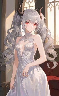 (indoord:1.5),(dragon horns:1.2),(1girl:1.2),(solo:1.2),illustration,(beautiful detailed face:1.3),(beautiful detailed hair:1.3),(beautiful detailed eyes:1.3),whole body,right human structure,(silver hair:1.3),(curly hair:1.3),(twintails:1.3),(messy hair:1.3),(long hair:1.5),(red eyes:1.2),looking at viewer,(medium breasts:1.3),(evening_gown:1.3),(cowboy_shot:1.3),