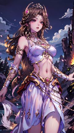 masterpiece,best quality,1girl, solo, brown hair, navel piercing, jewelry, white dress, long hair, navel, hair ornament, cowboy shot, dynamic pose, dynamic angle,