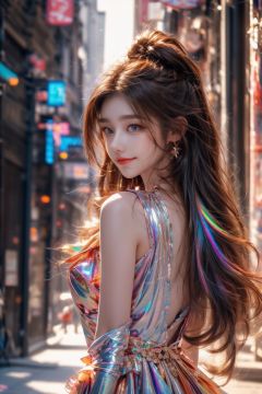 close up of young woman with beautiful blowing hair and mesmerizing eyes, wearing a flowing red gold dress made of petals, in a serene garden filled with blooming flowers, a representation of beauty and grace, charming, cute, beautiful, ultra detailed, dream like shot, sunset,((holographic))), (((rainbowish))), expressive, cinematic, dynamic pose,midjourney,1girl, solo,eluosi,upper_body,brown-hair