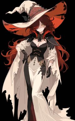 (1 girl),(solo),(mature female:1.3),(black background:1.3),illustration,disheveled hair,(beautiful detailed face:1.3),(beautiful detailed hair:1.3),(beautiful detailed eyes:1.3),whole body,right human structure,red hair,(messy hair:1.4),long hair,(hair over one eye),yellow eyes,(large breasts:1.1),(witch:1.2),(standing),broken clothes,gloves,