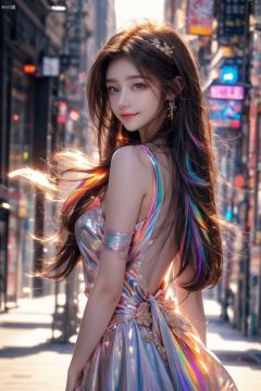 young woman with beautiful blowing hair and mesmerizing eyes, wearing a flowing red gold dress made of petals, in a serene garden filled with blooming flowers, a representation of beauty and grace, charming, cute, beautiful, ultra detailed, dream like shot, sunset,((holographic))), (((rainbowish))), expressive, cinematic, dynamic pose,midjourney,1girl, solo,eluosi,realistic,long leg