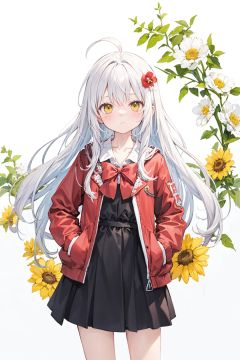 (best quality), ((masterpiece)), (highres),standing,original, extremely detailed wallpaper,crown,gradient hair,(an extremely delicate and beautiful),(loli),(petite),white hair,bangs,ahoge,hair flowing over,curly hair,long hair,Yellow eyes, (red Jacket),white collared shirt,hair flower,fipped hair,floating hair,Frown,hands in pockets,black dress,red bowtie,(solo),cozy anime,houtufeng